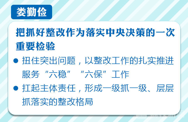 娄勤俭首先对国家统计局第6统计督察组在统筹推进疫情防控和经济社会发展的关键时刻,来我省通报督察反馈意见表示欢迎和感谢。他指出,督察组反馈的问题实事求是、客观中肯,我们诚恳接受、照单全收,一定坚持用习近平总书记关于统计工作的重要论述统一思想、武装头脑,切实从增强“四个意识”、坚定“四个自信”、做到“两个维护”的高度,认认真真抓好整改落实,确保党中央、国务院关于统计工作的重大决策部署在我省得到全面贯彻落实。娄勤俭强调,全省上下一定要提高政治站位,以坚决态度抓好整改,把抓好整改作为落实中央决策的一次重要检验,作为落实新发展理念的重要标尺,真正以高质量统计服务保障高质量发展。要扭住突出问题,以有力举措抓好整改,聚焦夯实高压线意识、营造良好统计生态、强化统计基层基础、查处违纪违法问题,以整改工作的扎实推进服务“六稳”“六保”工作,把督查整改成果不断转化成制度建设的成效。要扛起主体责任,以严实作风抓好整改,切实压紧压实第一责任人职责,着力加强协调调度和督查督办,自觉主动接受监督,督促各地各部门守土有责、守土尽责,形成一级抓一级、层层抓落实的整改格局,推动整改工作取得实实在在的成效,努力向党中央交上一份合格答卷。