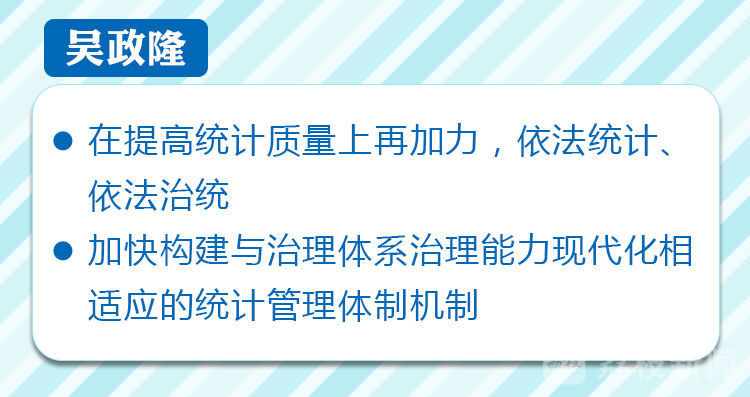 吴政隆表示,各级各部门要认真学习、坚决贯彻习近平总书记关于统计工作重要论述和党中央、国务院决策部署,增强“四个意识”、坚定“四个自信”、做到“两个维护”,迅速传达会议精神,在政治站位上再提高、在抓好整改落实上下功夫,力戒形式主义、官僚主义,确保统计督察反馈意见及问题线索点出的每个问题、提出的每条意见都落实在整改方案和具体行动中,确保整改工作经得起历史、实践和人民检验。要以督察整改为新起点,在提高统计质量上再加力,着力增强统计工作科学性、权威性,着力提高统计数据真实性、准确性,依法统计、依法治统,加强改革创新,加快构建与治理体系治理能力现代化相适应的统计管理体制机制,以高质量的统计工作服务推动高质量发展,引导全省上下深入践行新发展理念,树立正确发展观政绩观,做好“六稳”工作、落实“六保”任务,不断书写新时代“强富美高”新江苏建设新篇章。