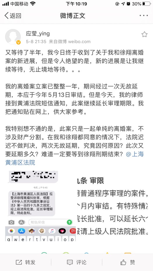 5月8日晚间,徐翔妻子应莹发布微博称:“我的离婚案立案已整整一年,期间经过一次无故延期,本应于今年5月13日审结,但是今天,我的律师接到黄浦法院短信通知,此案继续延长审理期限。”