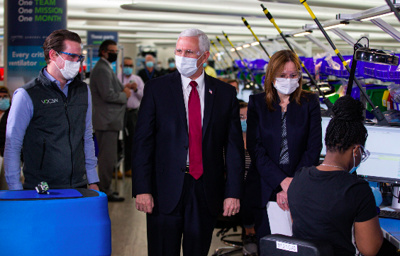 彭斯4月30日参观一家呼吸机工厂。海外网 图