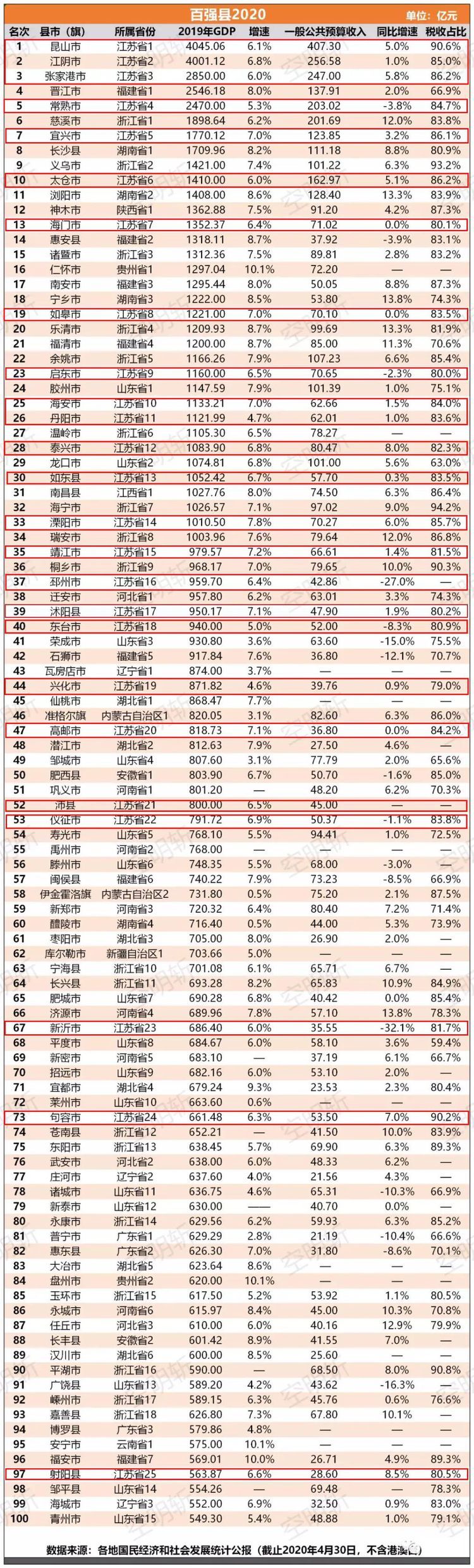 中国百强县(市)全称为中国县域经济与县域竞争力百强县(市),是对中国县级行政区域以县份、县级市与旗为主,包括部分市辖区的经济综合实力评价。这是县域经济研究最为权威的排行榜之一,常常成为衡量区域经济的重要参考榜单。