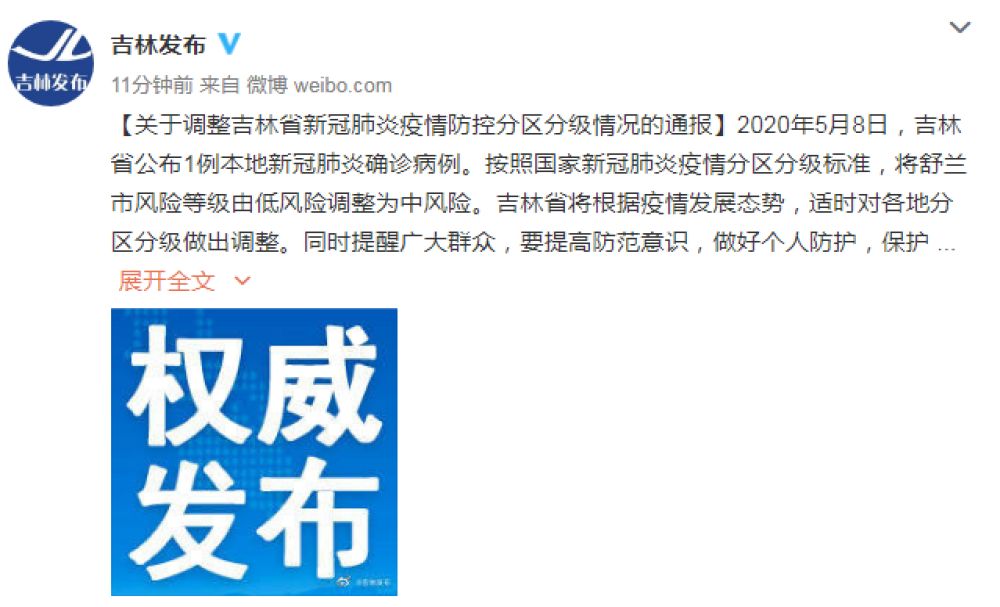 荔枝新闻讯 据吉林市人民政府新闻办公室官方微信消息,吉林省新冠肺炎疫情防控工作领导小组办公室9日发布《关于调整吉林省新冠肺炎疫情防控分区分级情况的通报》。通报称,2020年5月8日,吉林省公布1例本地新冠肺炎确诊病例。按照国家新冠肺炎疫情分区分级标准,将舒兰市风险等级由低风险调整为中风险。