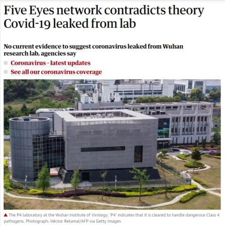 本周,英国《卫报》援引情报人士说,没有证据表明新冠病毒源于武汉的病毒研究所。该人士指出,澳大利亚《每日电讯报》指责“中国故意隐瞒疫情”的15页调查报告并非来自“五眼联盟”的情报。