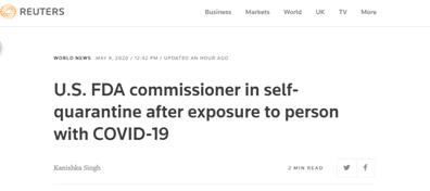 路透社9日报道称,FDA发言人8日晚在一份电子邮件声明中说,“正如哈恩今天在给员工的一份通知中所写,他最近接触了一名新冠病毒检测呈阳性的患者。根据美国疾病控制与预防中心的指导方针,他将在未来两周内处于自我隔离状态。”