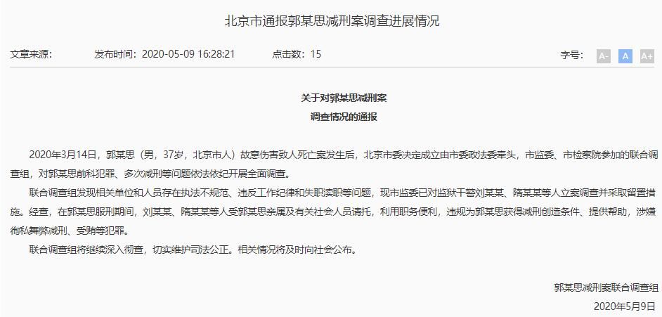 5月9日,北京市司法局发布通报称,今日,郭某思减刑案联合调查组发布了对郭某思减刑案件的调查情况通报,此案暴露出市司法局个别干警的问题,性质严重,教训深刻。市司法局一定深刻反思,坚决整改。