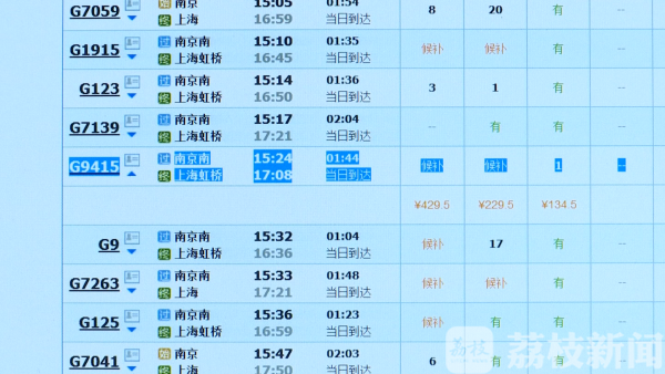为满足广大学生旅客复学需求,长三角铁路结合相关城市大中专院校学生复学返校情况,有计划增开“复学专列”,其中首趟专列G9415次从蚌埠南到上海虹桥将于5月15日开出。目前,该趟列车车票已经在12306网站发售,不过记者注意到,除了始发站外,沿途车站的余票并不多。