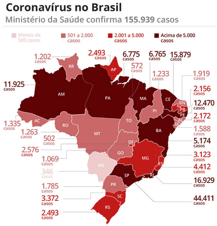 巴西各地确诊病例数(图片来源:巴西媒体环球网)