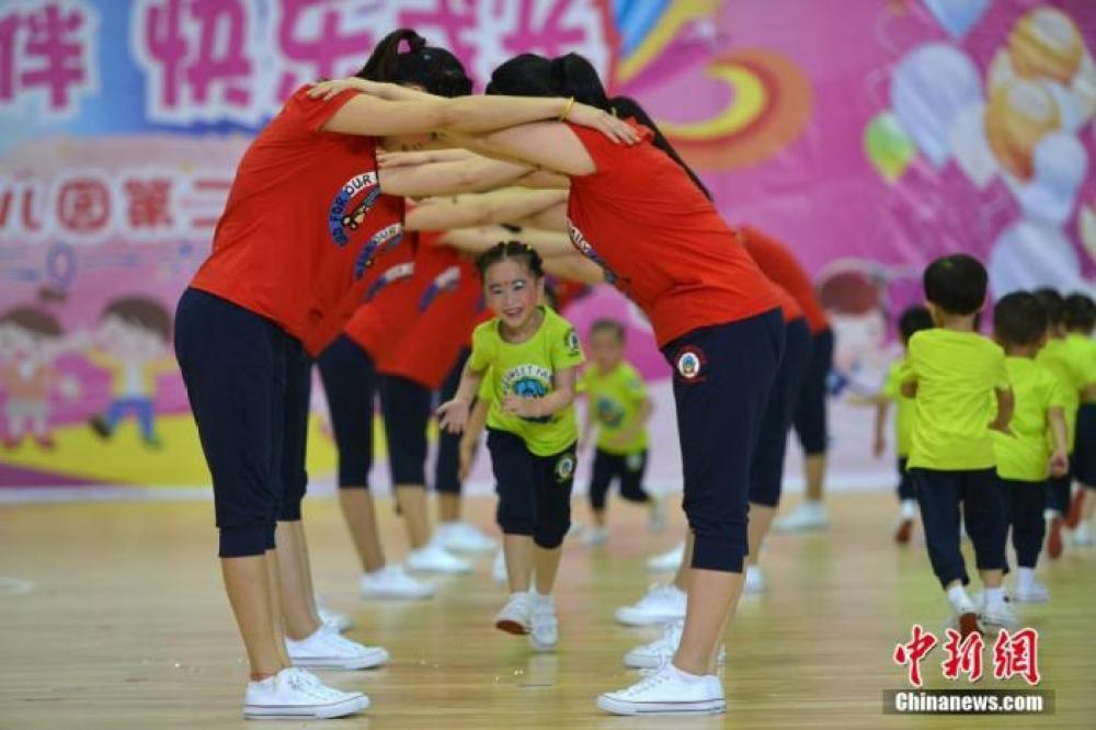 ↑ 资料图:广西桂林市龙胜各族自治县民族体育馆,孩子们和家长在表演亲子操。中新社记者 潘志祥 摄