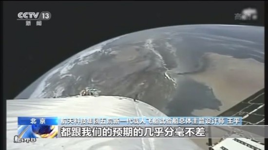 航天科技集团五院新一代载人飞船试验船总体主管设计师 王平:每一次变轨都跟我们的预期的标称值几乎分毫不差,保证我们最后再入的精度。我们整个的飞行过程要考虑地球的自转影响,所以这个时间要控制得非常好,再加上我们自主控制,就保证了我们最后的落点精度也取得了一个很好的成绩。
