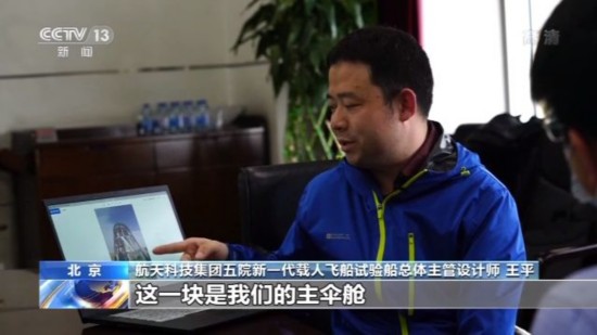航天科技集团五院新一代载人飞船试验船总体主管设计师 王平:这一块是我们的主伞舱,上面这两个筒,是它的减速伞的弹伞筒。
