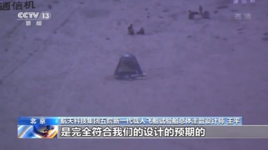 航天科技集团五院新一代载人飞船试验船总体主管设计师 王平:(试验船)回来的过程还是非常完美的。包括整个的再入的过程,还有之前轨道飞行的过程,精度都是达到了我们设计的指标的要求,包括落地的整个的过程也是非常的完美。它落地的时候整个舱是直立状态,完全符合我们的设计的预期的。