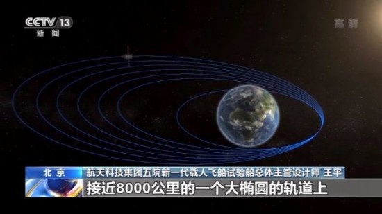 王平:前七次轨道机动是用于把我们的飞船抬到一个远地点,接近8000公里的一个大椭圆的轨道上,然后这样可以从一个很高的地方再入,可以获得比较高的再入速度,来模拟从月球返回的地高速再入的这么一个过程。
