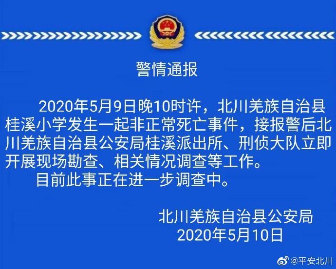 荔枝新闻讯 5月10日,据平安北川消息:5月9日晚10时许,北川羌族自治县桂溪小学发生一起非正常死亡事件,接报警后北川羌族自治县公安局桂溪派出所、刑侦大队立即开展现场勘查、相关情况调查等工作。