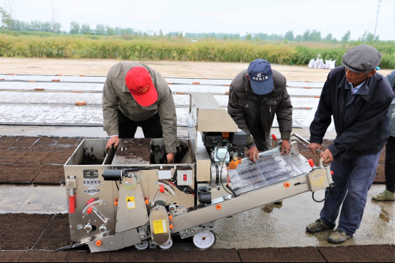 △孙建在利用自走式水稻秧盘播种机育秧