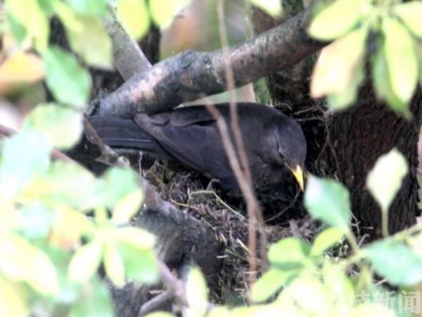 金域中央小区中陈先生家窗前有一棵樟树,长得有7米多高了,一对乌鸫夫妇居然在此“安家”。陈先生用长镜头相机隐蔽窗后,在窗户观察它们,发现两只乌鸫不时衔着泥草飞过窗口,经过一段时间的观察,他看到这两只乌鸫逐渐建起了一个窝。乌鸫夫妇的窝就筑在樟树杈上,整个鸟窝有碗的大小,是用泥草筑巢而成的,最里面还有一层贴身的铺垫物,这是用茅草压成的一床“弹簧褥子”。
