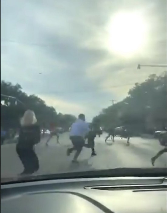 根据目击者在推特上发布的视频显示,枪击发生后,现场一片混乱,人们四散而逃,有的人蜷缩在汽车后面,有的人快速跑过马路,背景中可以听到警报声和爆破声。