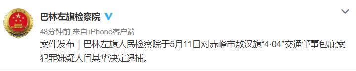 荔枝新闻讯 针对内蒙古敖汉旗政法委副书记酒驾致4死一事,内蒙古赤峰巴林左旗人民检察院官方微博5月11日通报案件最新进展:检方对赤峰市敖汉旗“4·04”交通肇事包庇案犯罪嫌疑人闫某华决定逮捕。