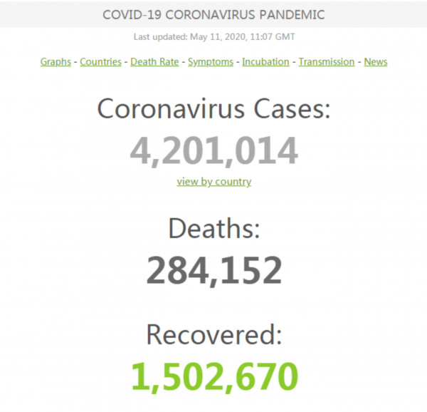 据Worldometers实时统计数据显示,截至11日11时,全球新冠肺炎确诊病例累计超过420万例,达4201014例;累计死亡284152例,累计治愈病例数1502670例。