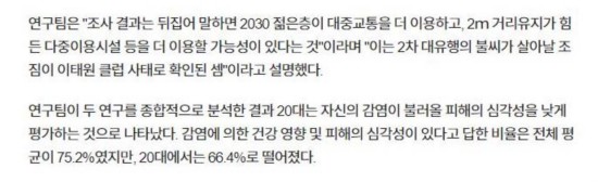 韩国的一项调查显示,20—30岁的年轻人可能会更多地使用大众交通工具,也难以保持2米的安全距离。此外,认为“新冠肺炎会对健康产生严重影响”的民众平均占比约75.2%,但在20多岁的年龄段中,这个比例只有66.4%。