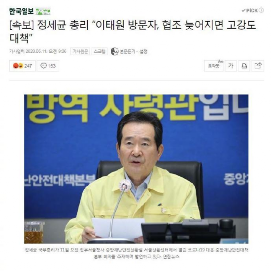韩国中央防疫对策本部部长郑银敬11日要求:访问梨泰院娱乐设施的人本周内,特别是今天(11)和明天(12日)必须迅速接受检查。