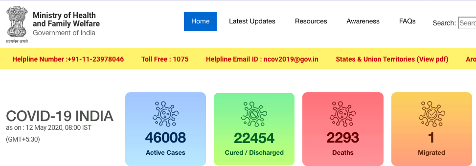 根据印度卫生部官网最新数据,截至当地时间5月12日上午8点(北京时间10:30),印度全境共报告新冠肺炎确诊病例70756例,其中治愈出院22455例,死亡2293例。