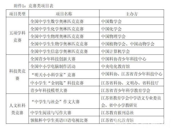 (一)竞赛类:高中阶段参加全国中学生五项学科竞赛(数学、化学、物理、生物、信息学)获得省级赛区三等奖及以上;或者科技类、人文社科类竞赛(竞赛项目详见附件1)获得省级赛区一等奖及以上。