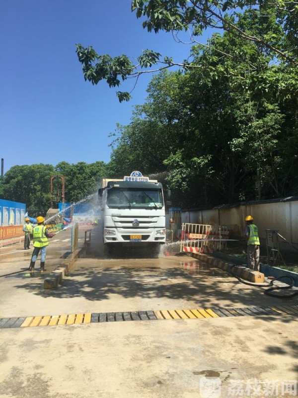在位于南京市龙蟠路上的钟山风景名胜区旅游服务中心项目工地,4名工人正在用高压水枪对一辆满载的渣土车进行出发前清洗,车辆冲洗后的泥浆水直接排进了地下沉淀池。据南京市玄武区城管工作人员介绍,由于这个工地靠近玄武湖,建设方使用了七级沉淀工艺对泥浆水进行处理。