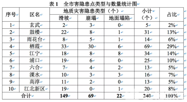 排查结果显示,南京市240处地质灾害隐患点主要分布在栖霞区、鼓楼区、浦口区、江宁区、溧水区和江北新区,玄武区、雨花台区、高淳区、六合区少量,秦淮区和建邺区无地质灾害隐患分布。全市地质灾害类型主要包括滑坡、崩塌和地面塌陷,险情等级以小型为主。