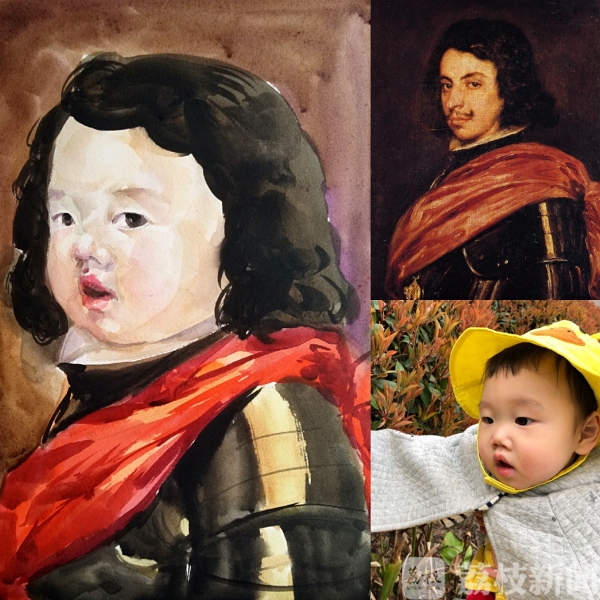 比如这张照片,照片是一个全正面的,但是根据原画来看,得是3/4侧面,这样才能跟画中人物的动态动作和服饰能够很好地契合。“所以我要通过其他的照片来判断,在我的脑海里面构建一个三维立体的宝宝的形象,然后让它转成这个角度,再把它的特征体现出来,这可能是绘制上面的一个难点。”
