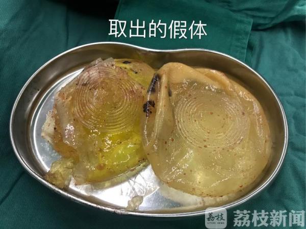 “右侧刚开了一个小切口,黄色的组织渗液就像喷泉一样涌出来,这是因为胡女士隆胸的假体长期渗漏,造成正常组织的病变坏死,组织的自我保护产生很多渗液,张力很大。左侧假体也同样发生破裂,这个假体不是很好取出,边缘已经破裂,所以假体的内容物已经到处都是,我们用生理盐水冲了很久,并且把周边坏死的组织也清理干净了。”淮安市妇幼保健院医学美容科负责人王川颖说。