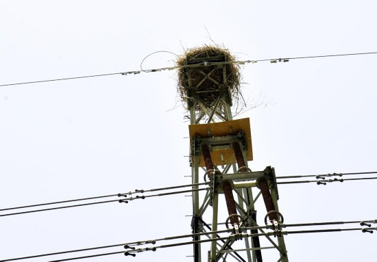 “60号塔上原来没有巢,建巢材料是从59号塔上搬过来的。”朱春华介绍,去年59号高压铁塔上有东方白鹳鸟巢,一对东方白鹳“夫妇”在那里繁育了4只幼鸟,长大后都飞走了,后来巢一直空着。今年4月,他们接到供电公司电话,说有两只东方白鹳成鸟到59号塔上拆巢,并将巢运到东边的60号塔上。