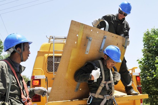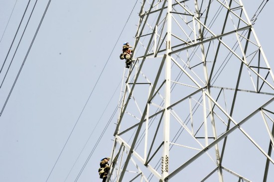 高压铁塔高度达到55米,防护挡板有20多斤重,加上带电作业(人与线路保持1.5米的安全距离),登塔施工需要非常小心,难度较大。从11时开始,两名工人开始登塔,到下午1点多才安装结束。