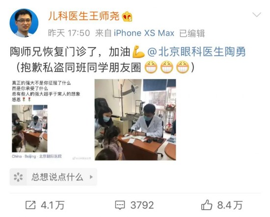 据@儿科医生王师尧 微博消息,此前被砍伤的北京朝阳医院眼科医生陶勇,于5月13日恢复出诊。