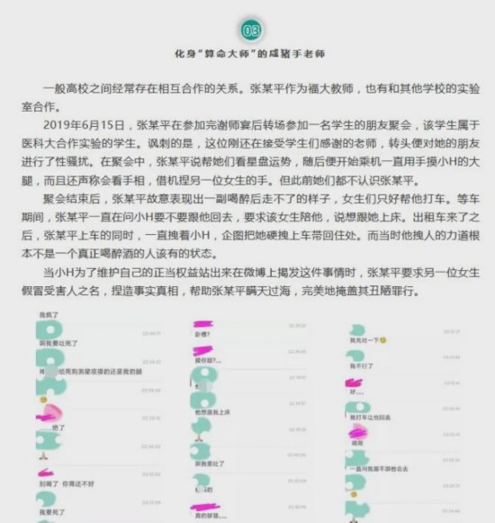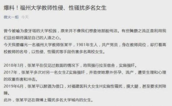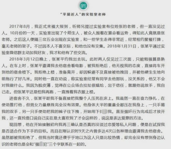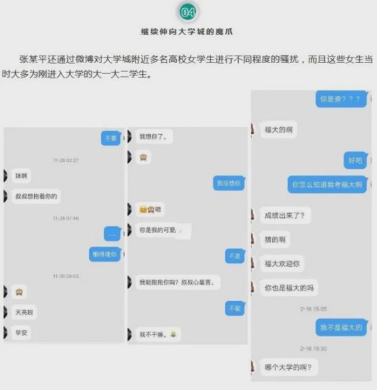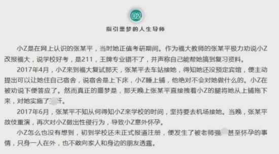 对爆料中提到的另一位女生Z,张某平说,他们是2016年“网恋”,在世纪佳缘上认识,并不是通过“性骚扰”认识的,2017年4月女生来到福大参加研究生复试,双方也是恋爱关系。