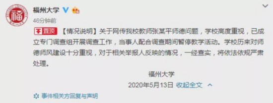 【情况说明】关于网传我校教师张某平师德问题,学校高度重视,已成立专门调查组开展调查工作,当事人配合调查期间暂停教学活动。学校历来对师德师风建设十分重视,对于相关举报人反映的情况,一经查实,将依法依规严肃处理。