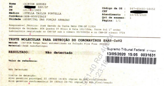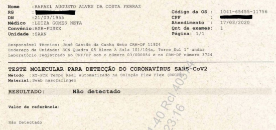 今年3月上旬,博索纳罗曾率巴西政府代表团访问美国,返回巴西后,该代表团成员中至少有23人确诊新冠肺炎。博索纳罗本人于3月12日和3月17日分别进行了两次新冠病毒检测,并在社交网站上宣布检测结果为阴性,但是他一直拒绝展示实验室的检测报告。第三次检测样本于3月18日递交至奥斯瓦尔多·克鲁兹研究所进行检测,于5月13日首次披露检测结果为阴性。