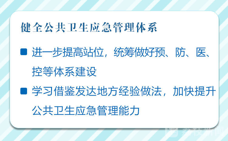 会议肯定了我省公共卫生应急管理体系和能力建设、应急物资保障体系和能力建设取得的积极进展。会议强调,健全公共卫生应急管理体系是中央的重大部署要求,是一项极其重要而紧迫的战略任务。要进一步提高站位,立足于满足江苏发展需要、关键时候支撑全国的定位,按照平战结合的思路,统筹做好预、防、医、控等体系建设。要学习借鉴发达地方经验做法,在疾控中心建设、国家重点实验室建设、应急物资储备等方面加大力度,把能做的事抓紧做起来,加快提升公共卫生应急管理能力,确保走在全国前列。相关部门要加强协作,共同把这项工作抓紧抓实抓出成效。