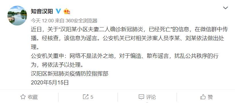 荔枝新闻讯 据武汉市汉阳区委宣传部官方微博@知音汉阳 5月15日发布消息,近日,关于“汉阳某小区夫妻二人确诊新冠肺炎,已经死亡”的信息,在微信群中传播。经核查,该信息为谣言。公安机关已对相关涉案人员李某、刘某依法做出处理。