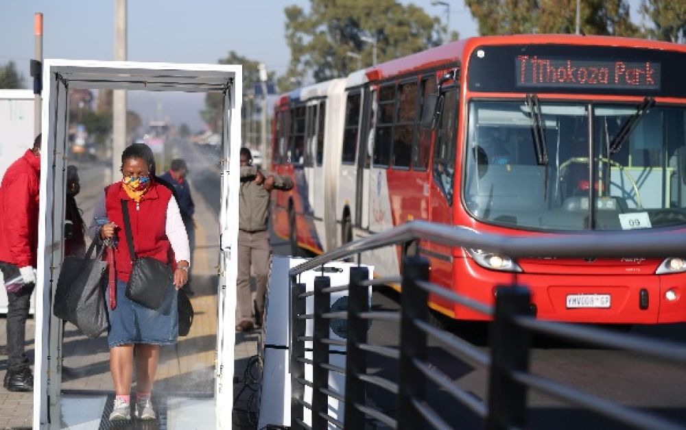 在南非索韦托,为防范疫情,乘客上公交车之前须走过“消毒门”。