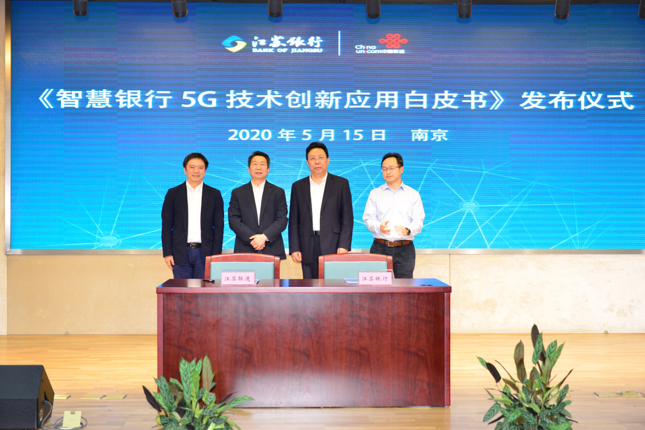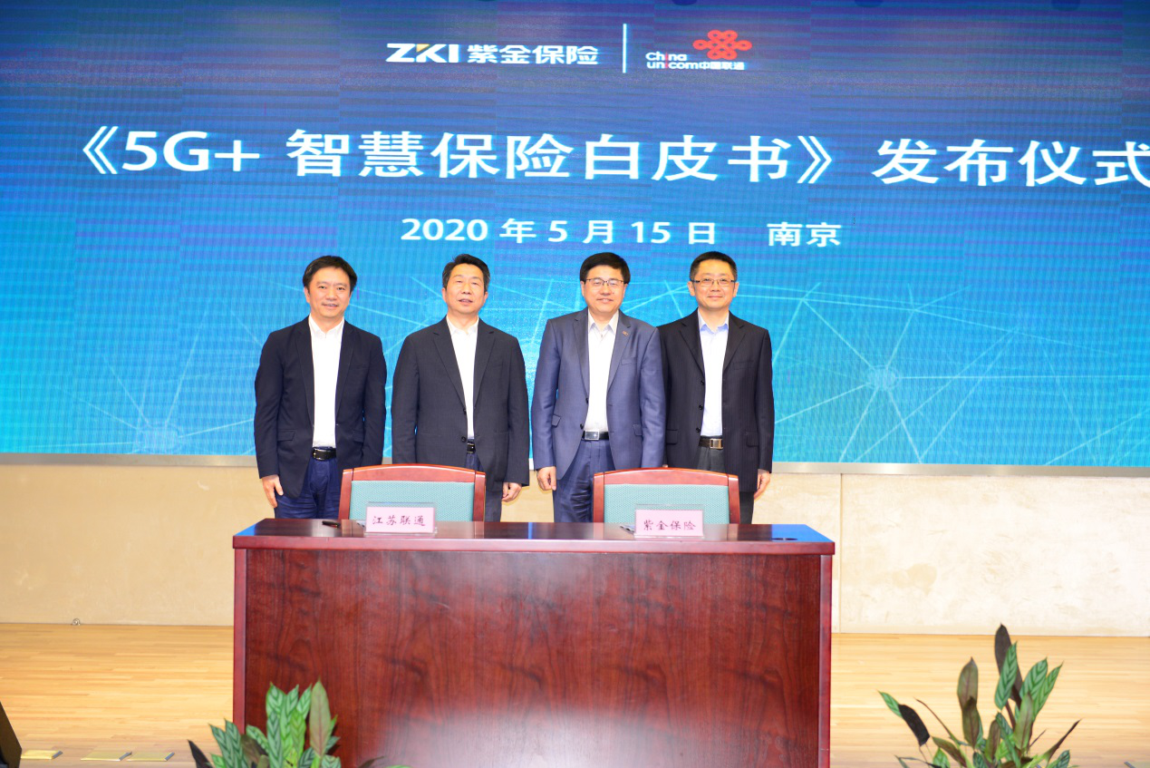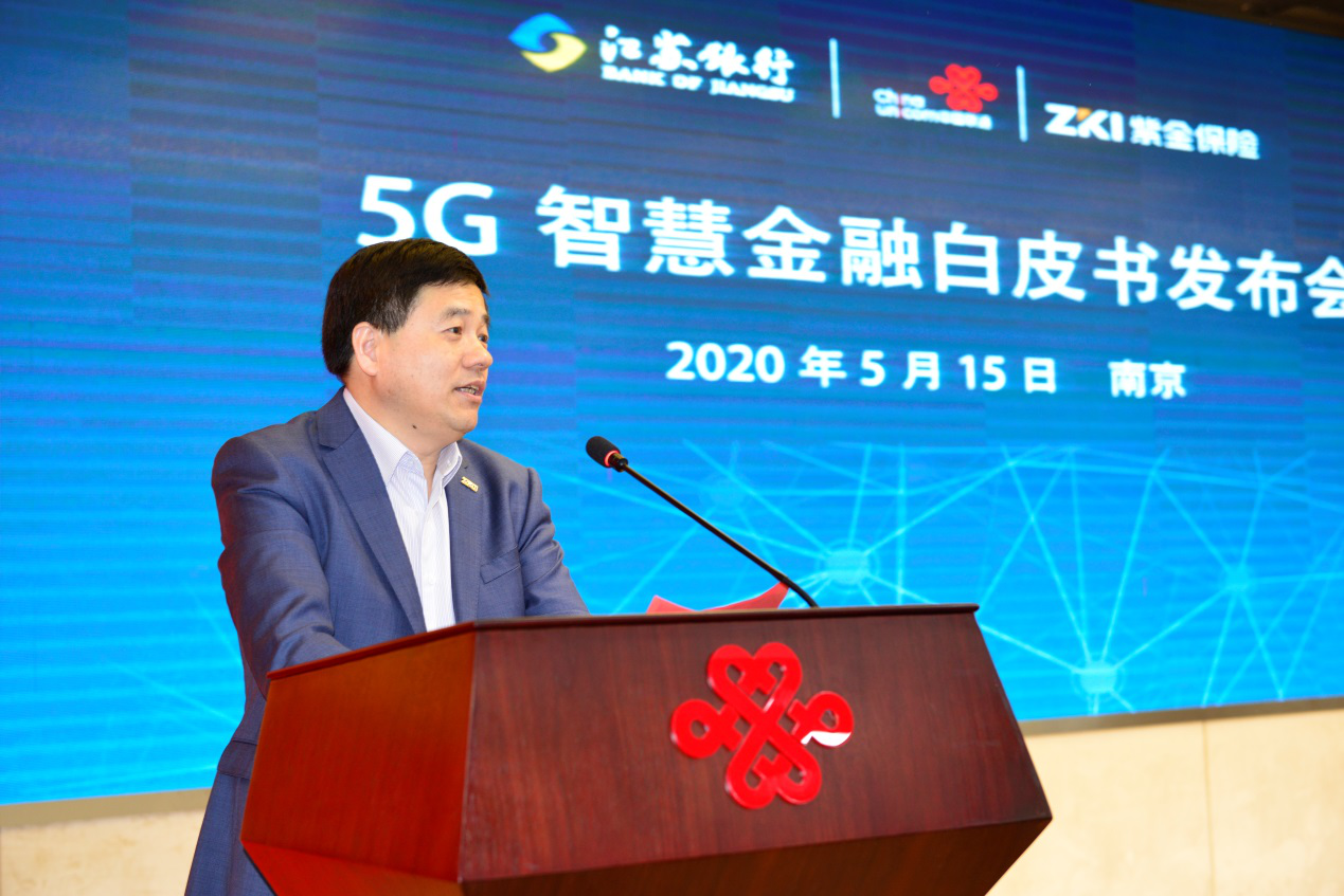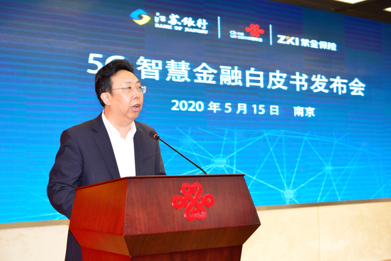2020年5月15日下午,江苏联通5G+智慧金融白皮书发布会在南京顺利举行。中国联通江苏省分公司联合紫金财产保险股份有限公司发布了《5G+智慧保险白皮书》,联合江苏银行股份有限公司发布了《智慧银行5G技术创新应用白皮书》。紫金财产保险股份有限公司总裁顾士新、副总裁陈加明、江苏银行股份有限公司副行长葛仁余、中国联通江苏省分公司总经理方一明、副总经理施巍巍出席本次白皮书发布会。