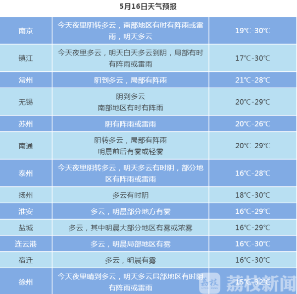 今天夜里到明天沿江和苏南地区多云到阴有时有阵雨或雷雨,其它地区多云到晴,其中明天夜里淮北局部地区阴有阵雨或雷雨。全省偏南风3-4级,雷雨地区雷雨时短时阵风7-8级。明晨最低温度:苏南地区19~20℃,本省东北部地区14~15℃,其它地区16℃左右。明天最高温度:苏南地区28℃左右,其它地区29~30℃。