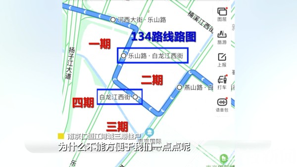 南京仁恒江湾城三期住户表示,“我们要走将近1公里的路才能坐到134路车,二期周边有两个134路站点,为什么不能方便于我们一点呢?”