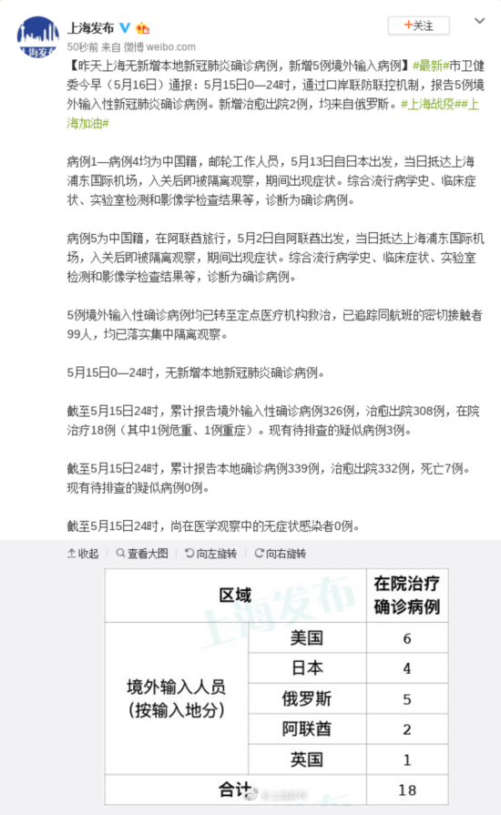 截至5月15日24时,累计报告境外输入性确诊病例326例,治愈出院308例,在院治疗18例(其中1例危重、1例重症)。现有待排查的疑似病例3例。