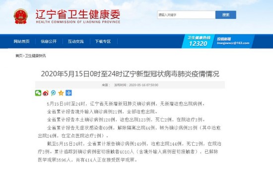 荔枝新闻讯 据辽宁省卫健委消息,5月15日0时至24时,辽宁省无新增新冠肺炎确诊病例,无新增治愈出院病例。