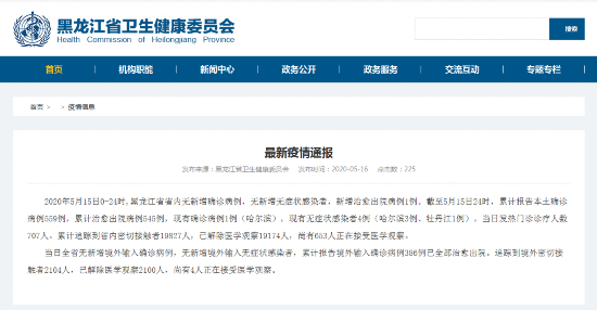 荔枝新闻讯 据黑龙江省卫健委消息,2020年5月15日0-24时,黑龙江省省内无新增确诊病例,无新增无症状感染者,新增治愈出院病例1例。截至5月15日24时,累计报告本土确诊病例559例,累计治愈出院病例545例,现有确诊病例1例(哈尔滨),现有无症状感染者4例(哈尔滨3例、牡丹江1例)。当日发热门诊诊疗人数707人。累计追踪到省内密切接触者19827人,已解除医学观察19174人,尚有653人正在接受医学观察。