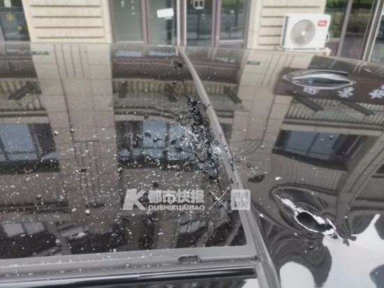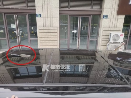 大概是掉下来的菜刀刀柄将车顶砸出了一个洞,刀面划伤了车身,然后被弹飞在地上。