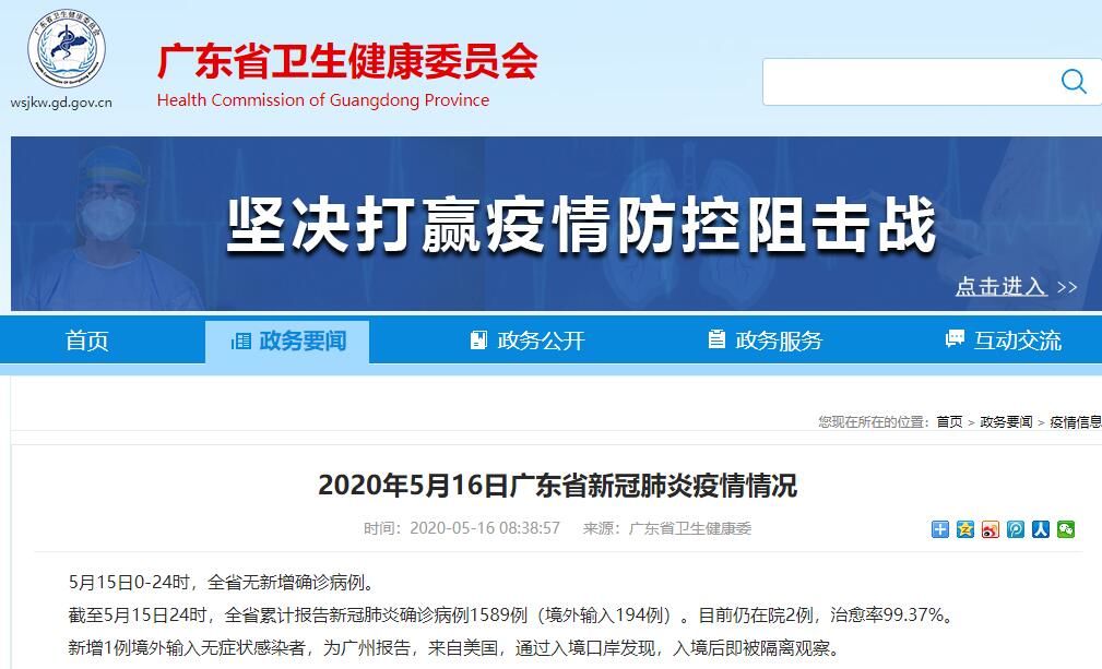 荔枝新闻讯 据广东省卫健委消息,5月15日0-24时,广东省无新增确诊病例。