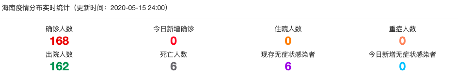 截至5月15日24时,海南省累计报告新型冠状病毒肺炎确诊病例169例,重症病例0例,死亡病例6例,出院病例162例。确诊病例中,海口39例、三亚55例、儋州15例、文昌3例、琼海6例、万宁13例、东方3例、澄迈9例、临高6例、昌江7例、陵水4例、定安3例、保亭3例、乐东2例、琼中1例。