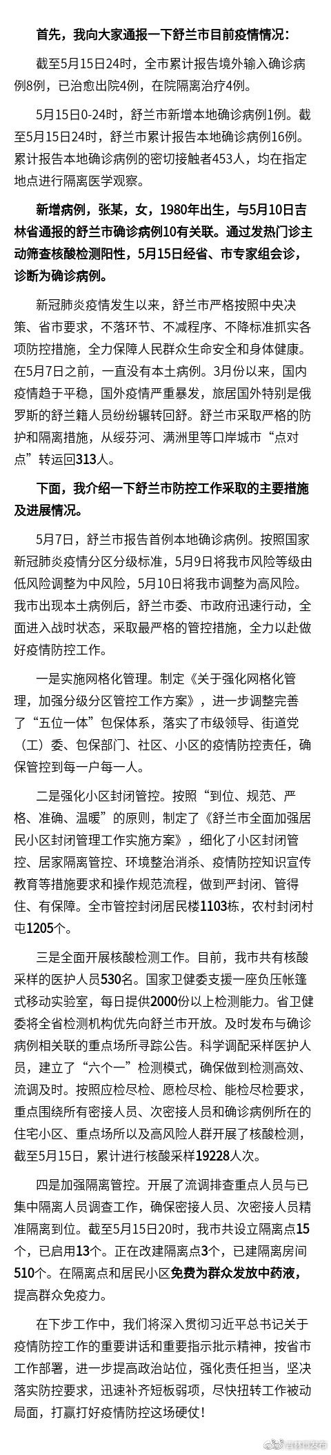 荔枝新闻讯 据吉林市政府新闻办公室官方微博消息,今天上午,吉林市疫情防控第四场新闻发布会召开。舒兰市政府市长金华介绍了舒兰市的疫情防控情况:
