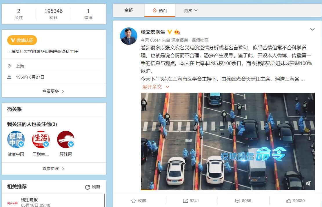 一个月后的5月11日,张文宏医生微博正式注册。